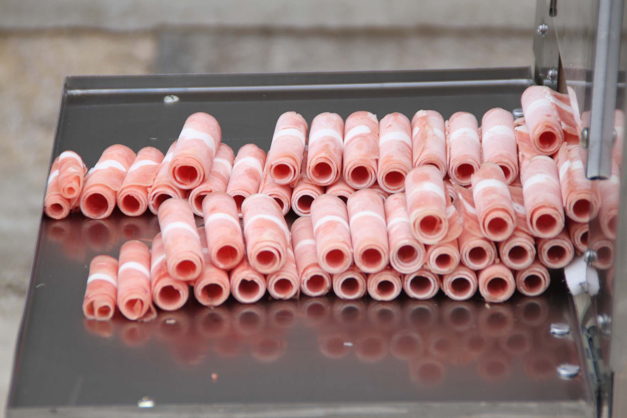 鴻祥瑞數(shù)控切片機(jī)HXR-S2型一次可以切2卷(板)羊肉或肥牛,鴻祥瑞數(shù)控切片機(jī)采用西門(mén)子PLC控制,步進(jìn)電機(jī)傳動(dòng),徹底解決了機(jī)械切片機(jī)故障率高的難題,真正意義上實(shí)現(xiàn)了全自動(dòng)化。紅外線感應(yīng)安全防護(hù)裝置(選裝),公司通過(guò)市場(chǎng)調(diào)研,特研發(fā)一次性刀具,解決部分客戶(hù)磨刀難的問(wèn)題。雙導(dǎo)向推進(jìn)器,自動(dòng)進(jìn)退,起刀高度18CM,可以立著切肥牛板,調(diào)整厚薄不用停機(jī),可根據(jù)所需要的厚度在數(shù)控開(kāi)關(guān)自動(dòng)加減,每小時(shí)可切肉50-100公斤,工作臺(tái)采用食品專(zhuān)用有機(jī)塑料板制成,保證食品安全、衛(wèi)生,肉卷無(wú)需解凍,可直接上機(jī)操作,并可切出多種卷形(粗卷、細(xì)卷、長(zhǎng)卷),成形整齊、美觀,并成排列狀,容易包裝,加工效率高、安全、節(jié)省人工。是大型火鍋店、大中型牛羊肉批發(fā)商的理想選擇。